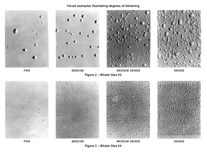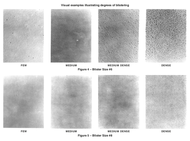 The coating film shall be allowed to exhibit the dense pattern of #8 blisters, but shall have no more than the “few” pattern of #6 blisters as illustrated in the photographic reference ASTM D714. See Figures 2 through 5 for visual representations of the various degrees of blistering.