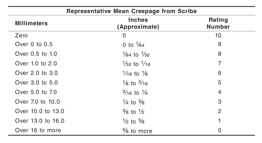 The coating film on the unscored surface of the test specimen shall have a rust grade of no less than 6 as defined in ASTM D610. See Table 1 and Figure 1 herein for evaluation of the rust grades. The coating film at the scribe line shall not be undercut by rust more than 1/8″ or a Rating Number 6 on each side of the scribe line when evaluated in accordance with ASTM D1654. See Table 2 herein, “Rating of Failure at Scribe (Procedure A)”.