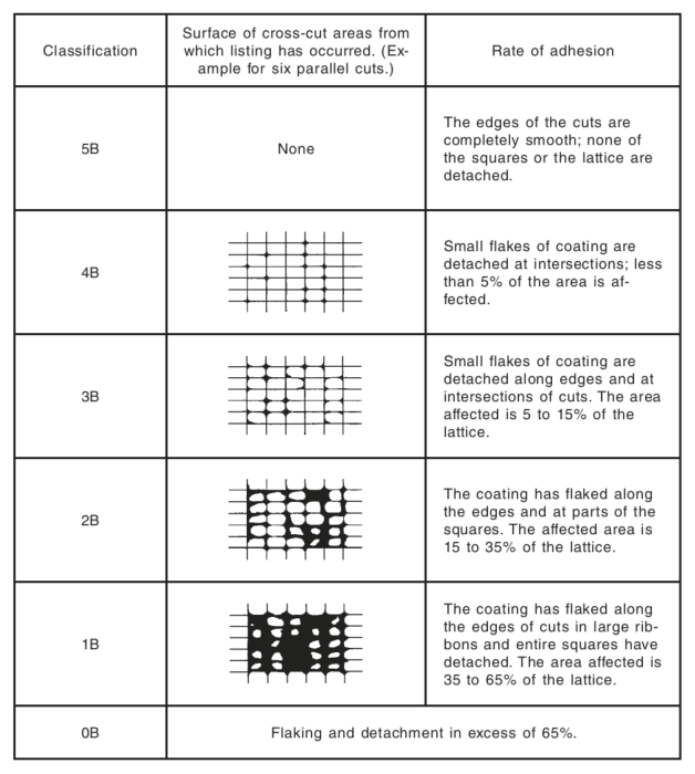 There shall be no adhesion loss less than a grade 3B as defined in ASTM D3359. This grade represents a film removal of between 5 and 15%. Table 3 herein illustrates the various classifications for adhesion loss.