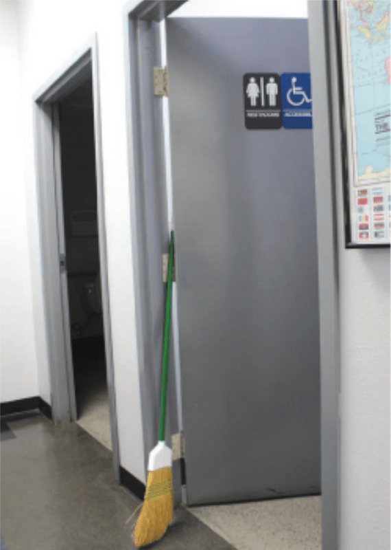 Earlier we referenced cleaning crews jamming a broomstick or mop handle into the door to prop it open. That places a lot of stress on the top hinge and can eventually compromise or even break the weld points of the hinge reinforcements. This results in a sagging, improperly gapped door, or worse yet, an inoperable opening.