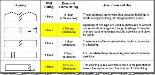 The IBC requires a higher fire rating for walls than for doors on the premise that combustible materials will be stored immediately adjacent to walls but not against operable doors. Doors located in stairwells or other enclosures of vertical passage through a building generally require 1 ½ hour door assemblies and 2 hour walls. This can be verified by referencing 2015 IBC® Table 716.5 or SDI-118 Table 1 (below).