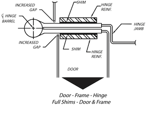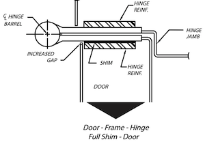 Hinge bind against the frame stops is possible field condition. Again, there are several ways of shimming which will move the door in the desired direction. The following guideline should be used in shim application.