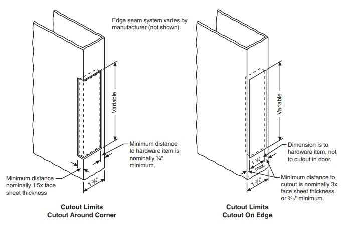 The following illustrations are intended to convey dimensional limitations of the hardware items to be mortised into the edge of 1 3/4″ thick standard steel doors.