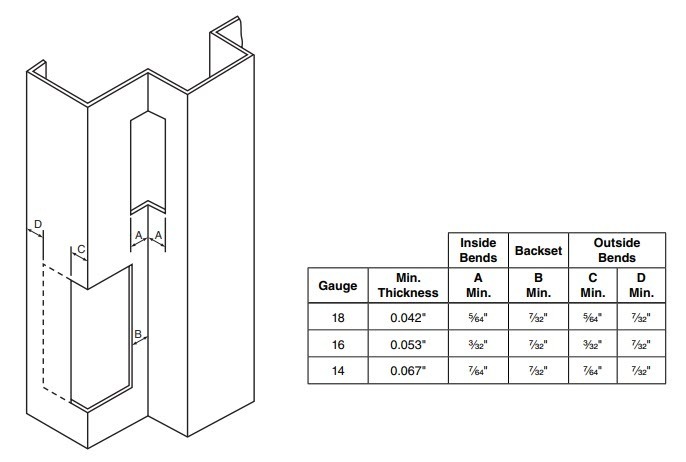 The ability to form a crisp aesthetic cutout in steel frames, especially in the vicinity of a bend line is directly influenced by the steel thickness and the proximity of the cutout to the bend line. A cutout too close to the bend line will result in a flare-out of the cutout area due to unevenly distributed stress along the brake die or rollform rollers.