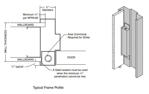 Situations exist where the electrical hardware preparation does not allow the drywall to penetrate the throat of a fire rated frame the required 1/2-inch in the immediate area of the hardware. When this occurs, a penetration or joint seal (e.g. intumescent caulk) listed for gypsum wall assemblies must be applied to the affected area; thereby, sealing any potential gap and ensuring the continuity of the fire barrier.