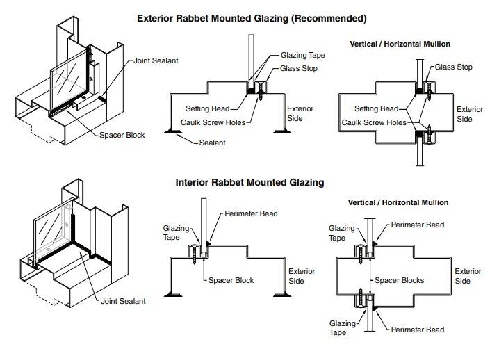 Whenever possible, it is strongly recommended that glass and glazing be installed on the exterior rabbet of the frame assembly. This will help act as a deterrent to water penetration.