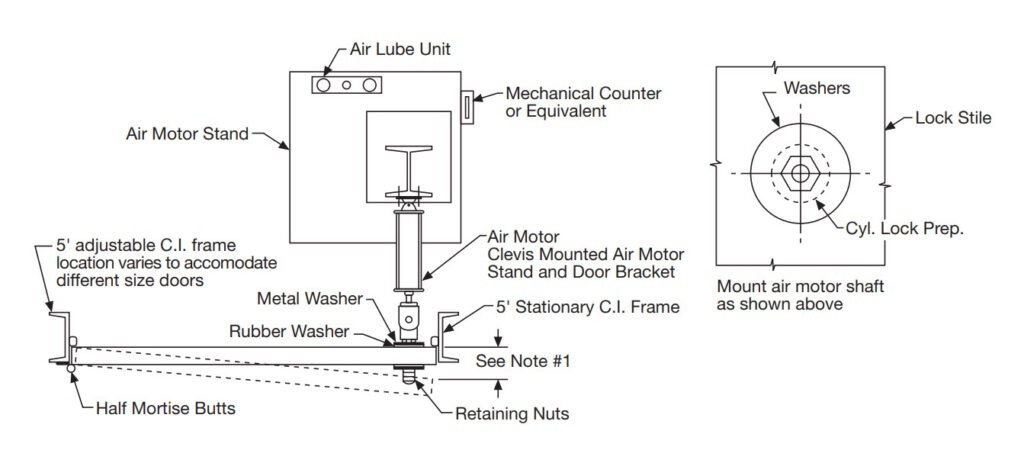 The cycling mechanism shall be positioned so that the connecting arm is perpendicular to the stop face of the door. It shall have a threaded swivel connector that is attached to the door through the lock preparation or by means of a bracket mounted directly to the door face at the vertical and horizontal location of the lock preparation.