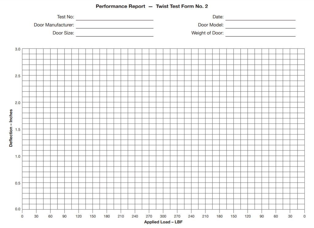 Loads in 30-pound increments shall be applied at the upper or lower lock edge corner through the screw jack and force gauge in an area as described in ANSI/SDI A250.4. The deflection noted on the dial indicator shall be plotted against the load applied to the corner. A maximum 300 pounds pressure shall be applied. The pressure shall then be reduced in 30-pound increments and the deflection recorded on the report form. A smooth curve drawn through the points shall graphically demonstrate the reaction of the door. Use “Performance Report – Door Test Form 2” below to graphically represent the deflections.
