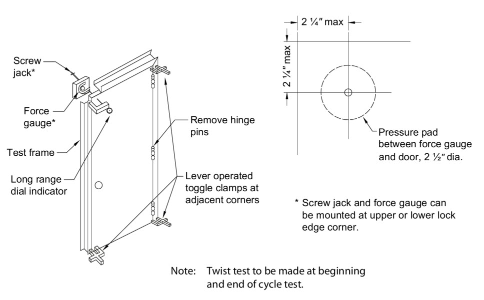 8.6 As a result of the twist test, the maximum deflection shall not exceed 2-1/2″ when loaded to 300 lb for Level C doors. For Level B and A doors, the maximum deflection shall not exceed 1-1/4″ when loaded to 300 lb.